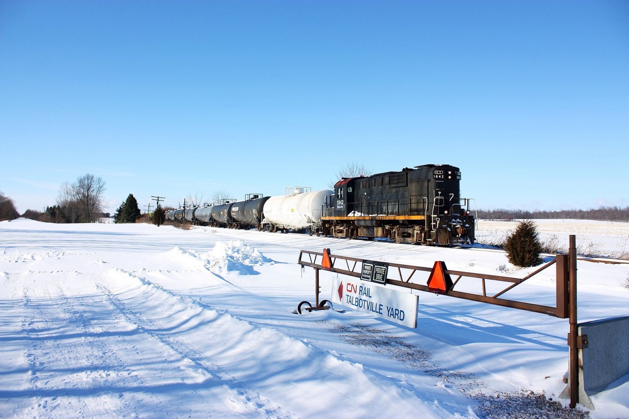 The St. Thomas & Eastern is in its last week of existence as it is seen passing the old Canada Southern diamond and a relocated CN gate used the block the CASO right of way at New Sarum.