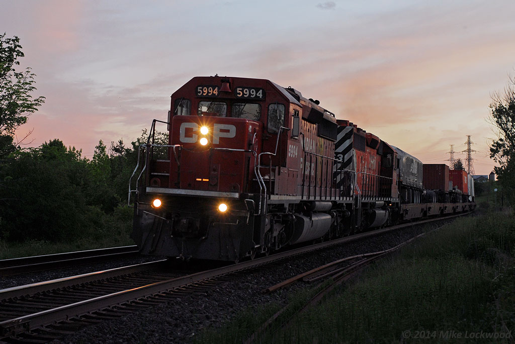 Caption: The longer days of summer (ok, technically still spring) allow photography once more of the eXpressway trains, or at least at the west end of the corridor, the daily Toronto - Montreal train. At a few minutes to 9PM, CP 5994 and 5763 pass the Cherrywood station name sign with 132's train in tow. 2056hrs.