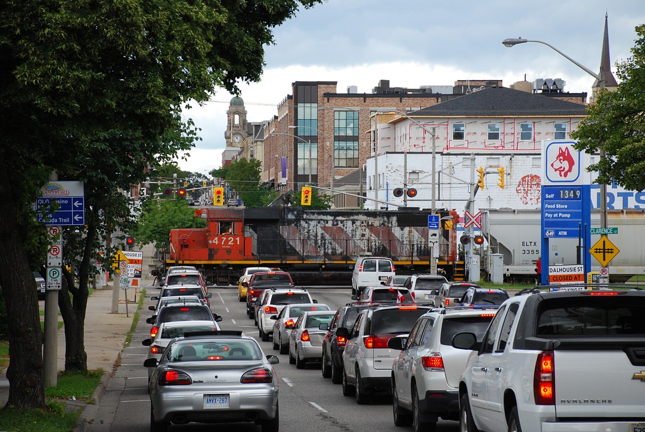 Caption: CN 580 continues to go downtown once a week to serve Ingenia, despite the fact that June 30 was supposed to be the last day that CN was going to provide service. I suspect CN is in negotiations with Ingenia to purchase and operate the Burford Spur, time will tell. After being delayed by a confused pedestrian that needed to be escorted off the track by one of the crew memebers, CN 580 is shown slowly crossing Dalhousie Street, much to the delight of all the queued motorists.