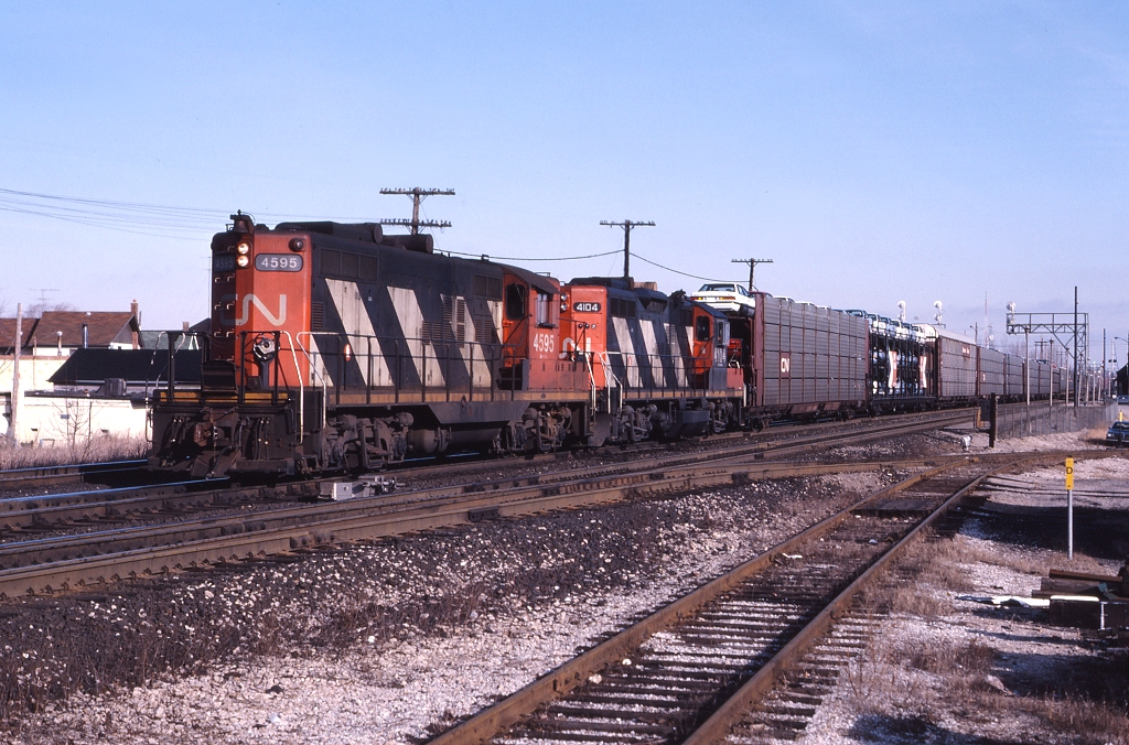 Caption: CN 557 rolls through Burlington West behind CN 4595 and CN 4104