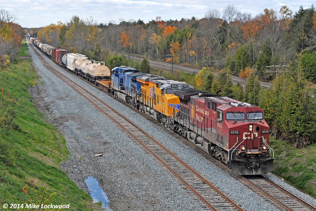 Caption: CP second 240 rolls alongside the newly extended east end of Spicer siding behind CP 8578, UP 8216, and CEFX 1007. The view here was vastly different a few short years ago, with the east end of Spicer being located back towards where the train disappears around the corner and CN was double tracked, as opposed to todays triple track. Had you visited last winter, you'd have found a temporary switch installed in the approximate location of the lead unit, however seeing as the new siding was not tied into anything at the west end, it was of no practical use. The chicane is also new, and likely in order to avoid a bridge pier. 1249hrs.