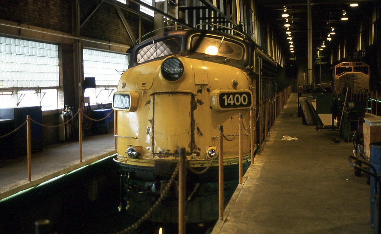 Caption: RLGN 1400 and 1401 underwent repairs and repainting at the Ontario Northland Railway shops in North Bay, ON; then they were tested on nearby Ottawa Valley RaiLink before being shipped off to the Mackenzie Northern Railway. There they got beat up battling the wilds of northern Alberta before getting shipped back to Ontario, this time to the Goderich-Exeter Railway. After a few years of service on GEXR and a few more years sitting broken and dead in Goderich, the two F units ended up on the Ontario Southland Railway. OSRX 1401 is back in service,and hopefully 1400 will be alive and well soon. These two units seem to have nine lives. After seeing them parked in the deadline in Mclennan, AB surrounded by pools of oil I thought they were done for... who knew they would continue on as well as they have? RLGN 1400, still in VIA Rail paint, is shown sitting inside the Ontario Northland's North Bay shop in the company of ONT 2103.