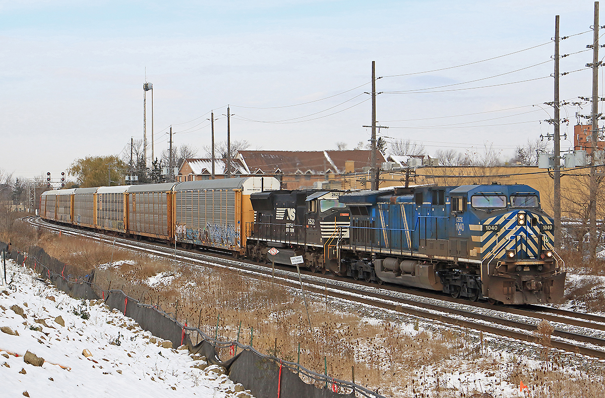 Caption: Coming into frame and the sun makes it out just in time! CEFX 1040 & NS 2622 take charge on 240 rumbling through Streetsville.