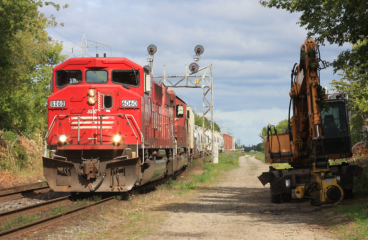 Triclops Soo 6060 and CP 6017 bring this small cut of cars to Lambton yard.