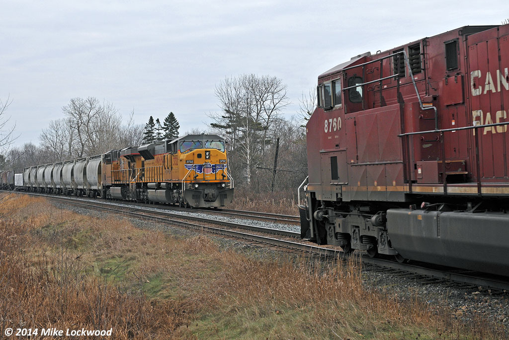 Caption: After cooling their heels in the hole for close to two hours, CP 142 finally arrives for a meet with 643 at Spicer. With 124 cars, 643 would not fit into any other siding between here and Toronto other than Oshawa, and the RTC didn't think they'd make Oshawa without delaying 142. With 142 also over siding length, UP 3732 West got to put the newly extended siding here to use. This is the new norm for the Belleville Sub... longer trains and longer delays. 1256hrs.
