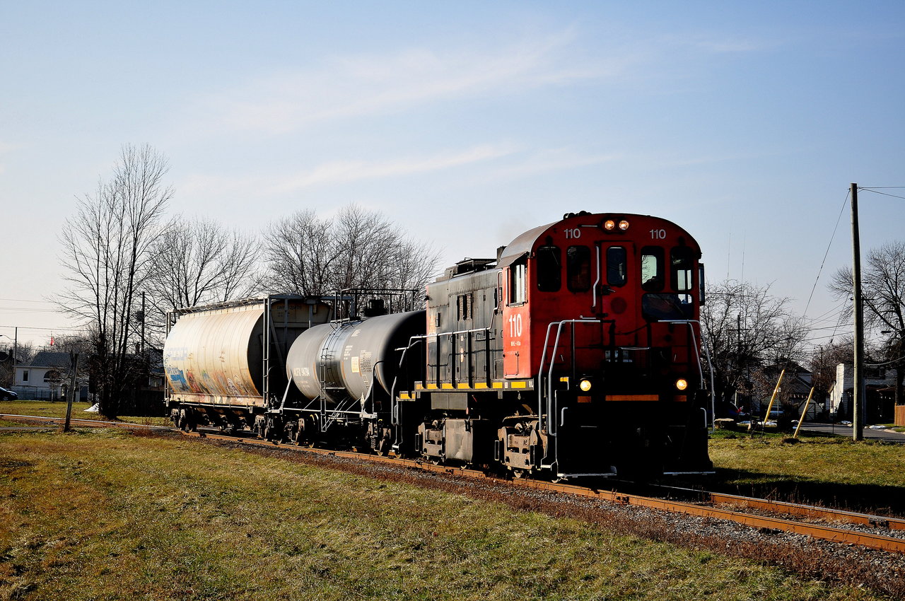 Caption: The daily move along the Fonthill Spur brings Trillium 110 carrying a couple of tankers back from the plant which they just serviced. Chemtrade Chemicals is the only service along the Fonthill Spur these days, and it's a rather quiet line, not seeing very much action anymore. Back in the 80's, this line went all the way to Welland, and had a few trains a day. In the 90's, this line was shortened to just about a miles length, ending in Thorold. In 1999, the Pine Street Lead off of this line, was abandon. It was quite famous for featuring a stretch of roadrunning. Maybe the line will return to normal size if Trillium gets their passenger service idea approved? Only time will tell.