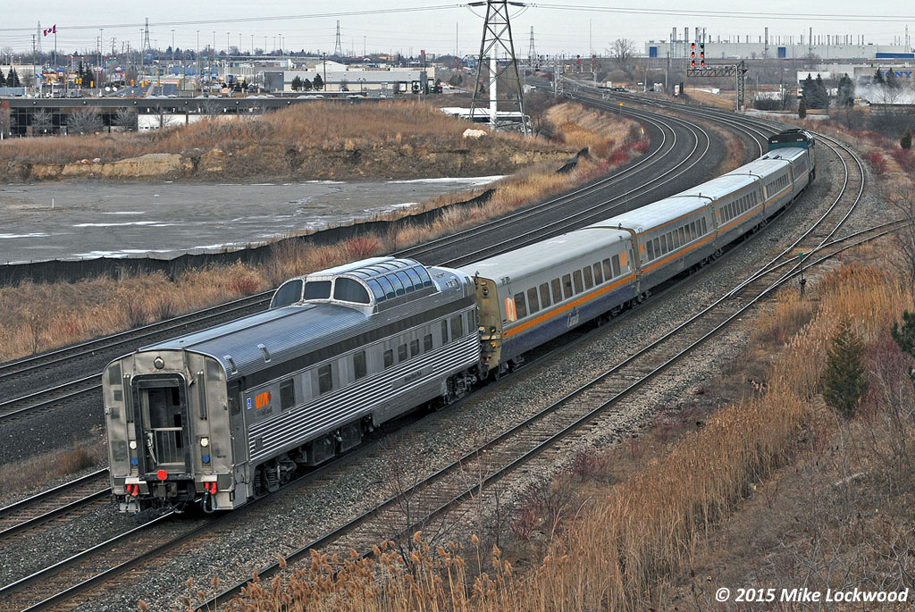 From the black striping above the window line, this is one of the Park cars that were being rebuilt in the US by Avalon Rail for VIA’s new Prestige class on the Canadian. I believe the rebuild work was being completed by CLN Industries in Levis, QC. Not sure if that would explain this move. I know some of these rebuilt cars are already in service. The new Prestige class on the Canadian is set to debut this summer. Apparently the rooms feature a big screen TV in addition to double beds. Not sure why you’d want to stare at a TV screen instead of the splendor of the Rockies after paying the premium fare! Speaking of the Canadian – Good news! VIA has announced that passenger rail service will resume from Toronto to Winnipeg and points west to Vancouver as of April 11, 2015: