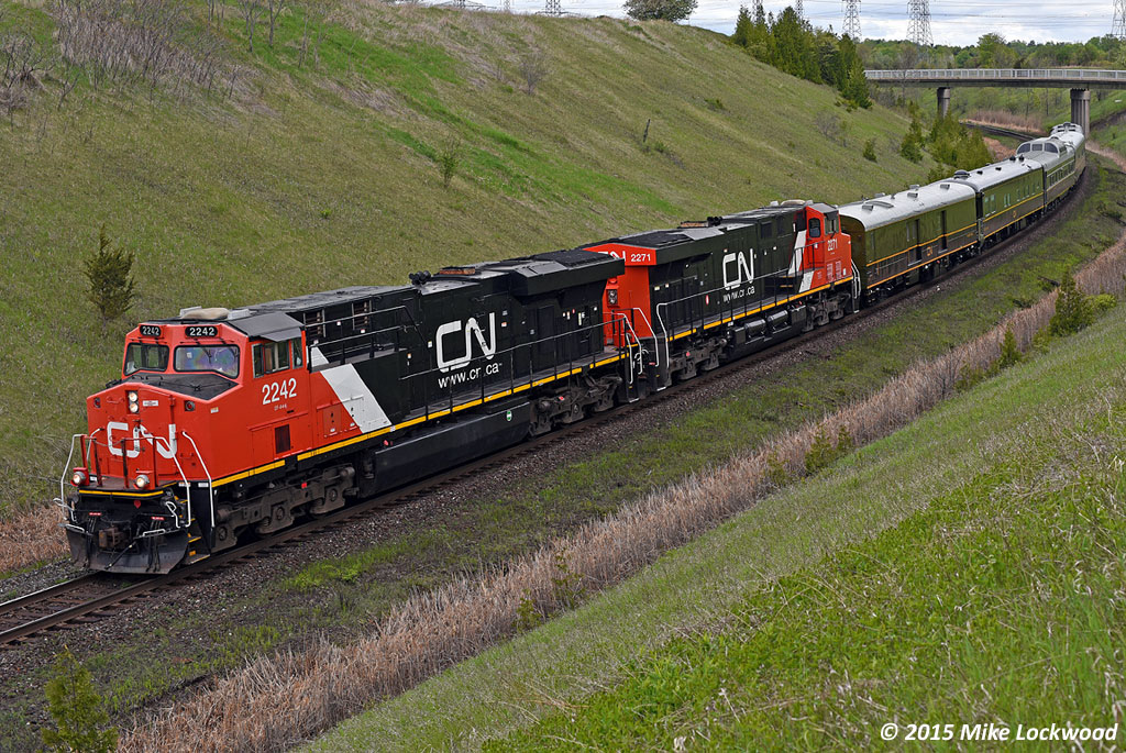 Caption: With the whole gang on board, P600 drops down the hill at Beare on the approach to the siding of that name and shortly, the junction with the Kingston Sub. Clean CN 2242 and 2271 make a nice looking, if not terribly interesting, set of power. 1138hrs.