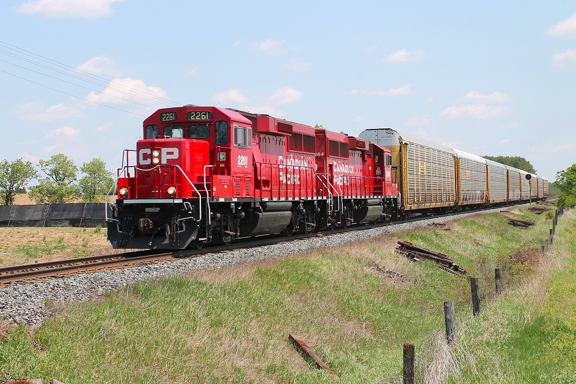 A very short all autorack train hauled by CP 2261 and 2264 at Gobles Rd crossing on its way to Pender.