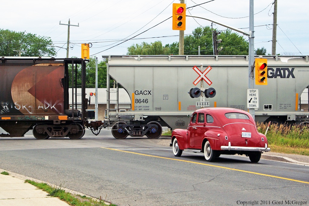 A shiny classic car waits as T07 departs Havelock.