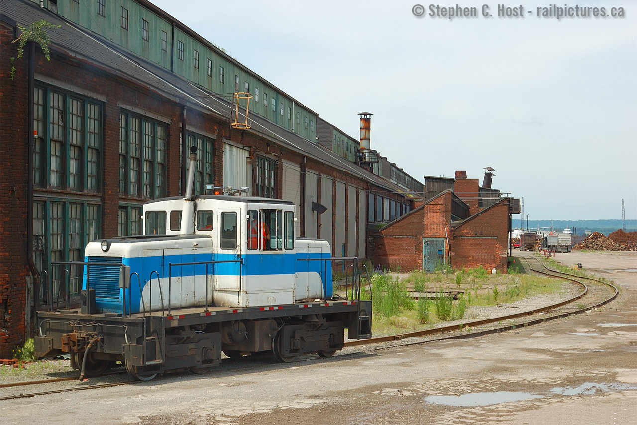 Caption: Deep in the depths of industrial Hamilton, one can find some interesting critters. This is or was the Railcare GE 45tonne locomotive, built in 1956, serial number 32535, per 2014 Trackside guide. Since this photo, Genesee and Wyoming has purchased Railcare and now use some of their facility as an engine shop. I have not seen this engine in a while - but I suspect it's still there somewhere. Railcare is located around the bend at right, curving behind the left building in a fan of tracks - this area was once more accessible, but the ever tightening marine port security and of course, US Steel security probably make this a difficult proposition even five years later.