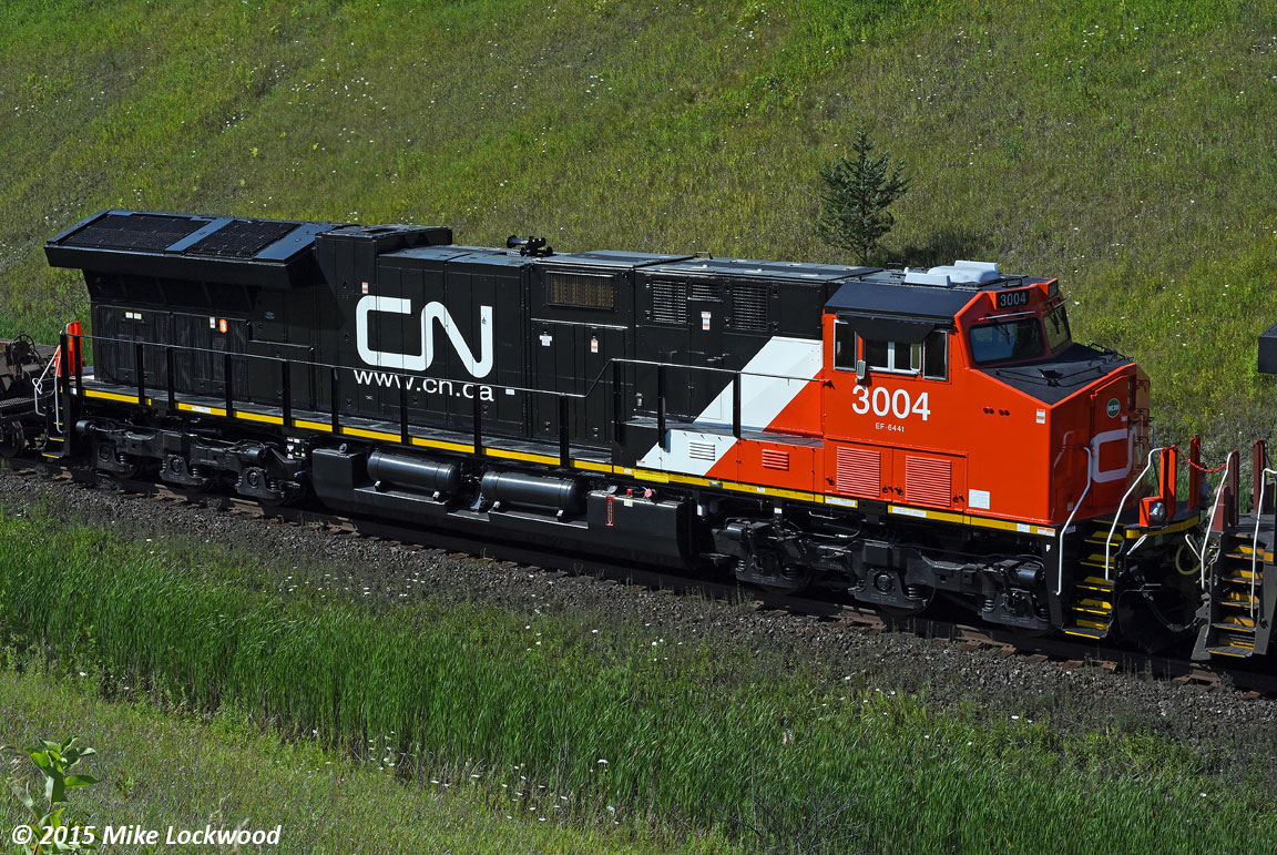 Caption: Brand new ET44AC 3004 trails the 2808 on train 121 at Beare. 1031hrs.