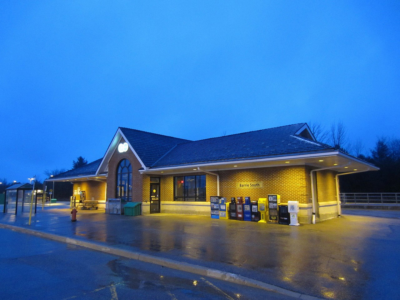 Caption: All is quiet as the Barrie South station waits out a wet cold evening.