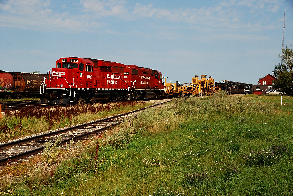 Caption: A westbound CP CWR train returns off the Tisdale Sub after dropping rail that was lifted off the Gravelbourg Sub