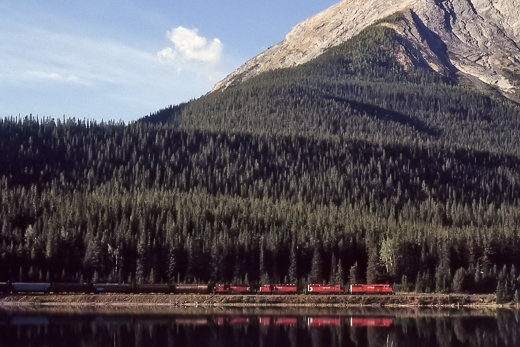Caption: Just over the continental divide, 4 sd40-2 variants are about to descend the Big Hill at Wapta Lake.