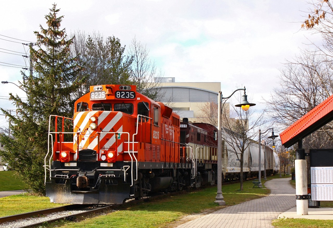 Caption: This shot is kinda bitter - sweet for me. After catching OSR working the south spur a few times I thought I'd get ahead of them leaving town and catch them at John Galt park adjacent to the River Run Centre. When I got there I linen up my shot and I thought "Well I probably have time, let's go check out the GHRA caboose", which I believe is stored just around the corner behind the River Run Centre. So I started walking and then I saw the lights coming around the bend. A few choice works came to mind which I cannot share, then I went back as far as I could and took the above shot. To add insult to injury the sun came out just as the cab of 8235 was about to exit the shadow of an apartment building. What would have added significantly to the shot I had planned, went to emphasised that I was on the dark side of the train. Well, the way I choose see it, any day with OSR is a good day. I'm sure pretty much everybody has been in a similar scenario at least once! Hope you enjoy! Mark
