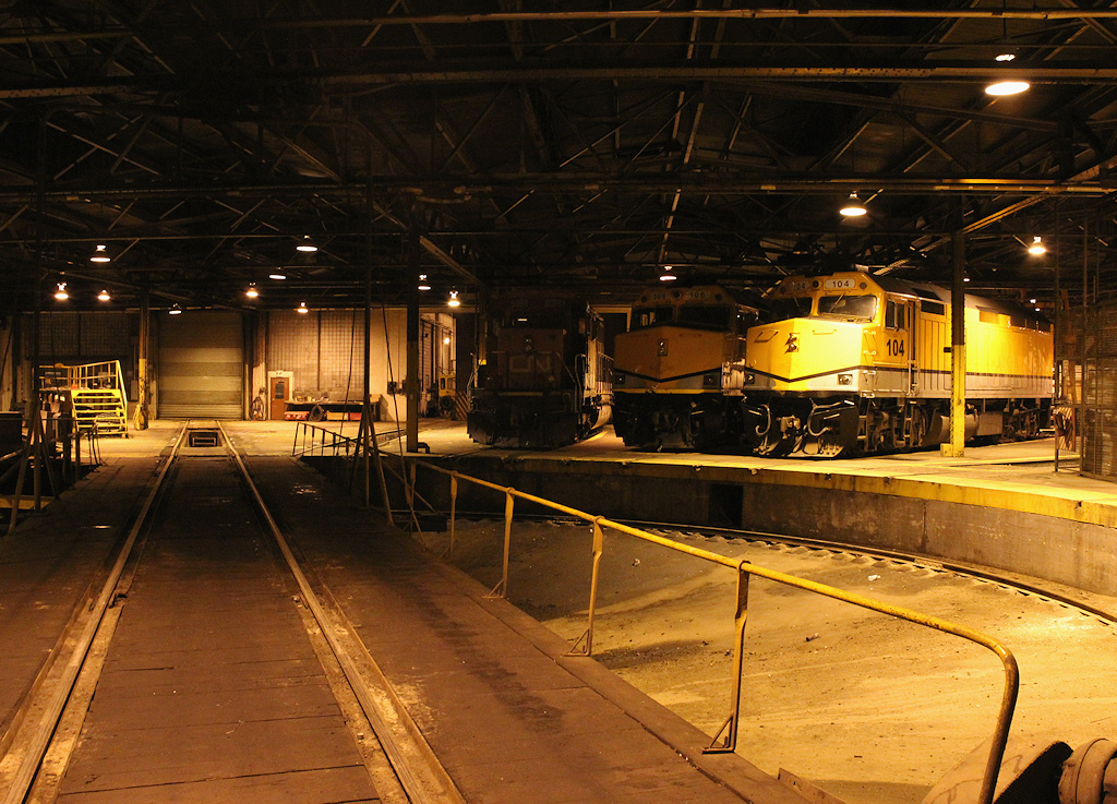 Caption: Inside the Steelton shops in Sault Ste Marie, ON... CN 105 is outside with the P631 trainset