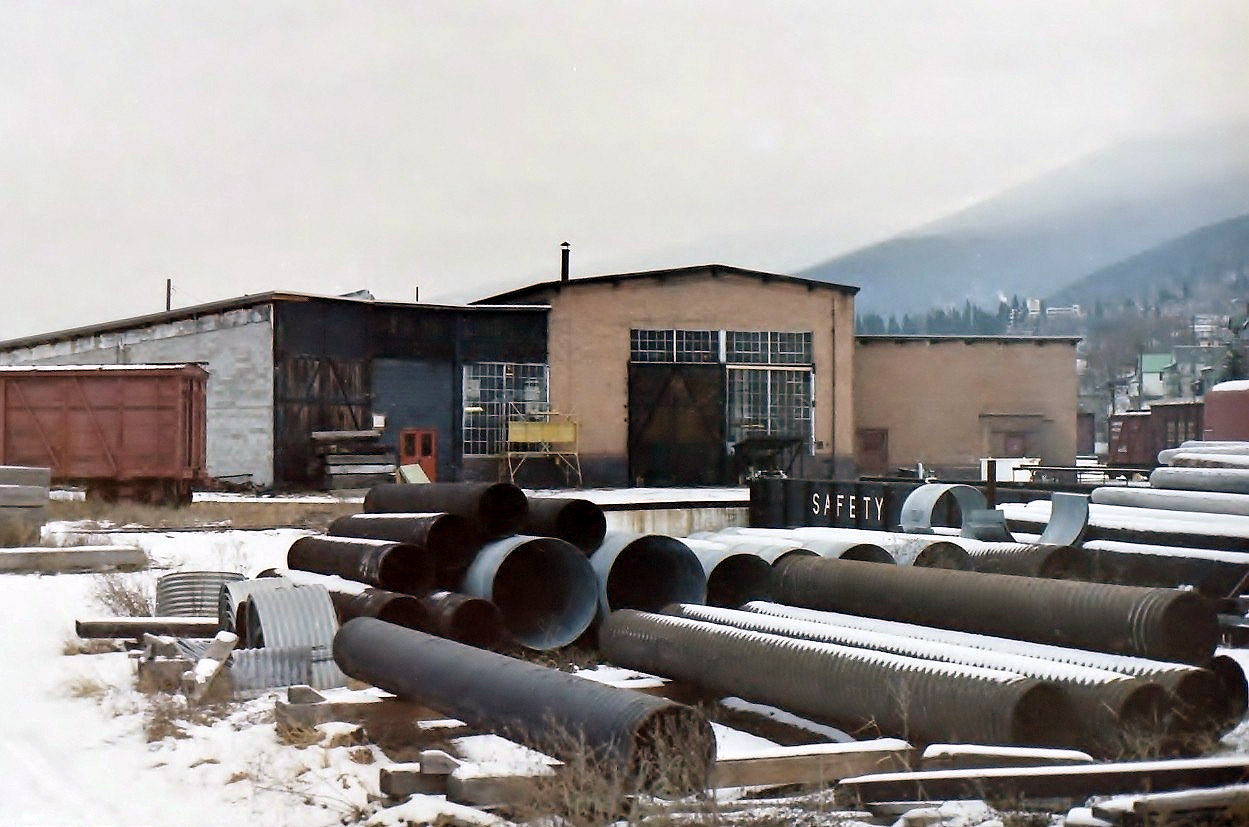 Caption: The weather had closed in & it was snowing lightly, but that did not stop me. So I took what little free time I had while in Nelson & after parking on the airport side of the property I walked over to the old roundhouse area. The steam locomotive stalls were long gone, but the back shop area of the building was still there, as was the turntable. The lights were on in the building, but I have no idea what it was being used for. Sadly all is now long gone!