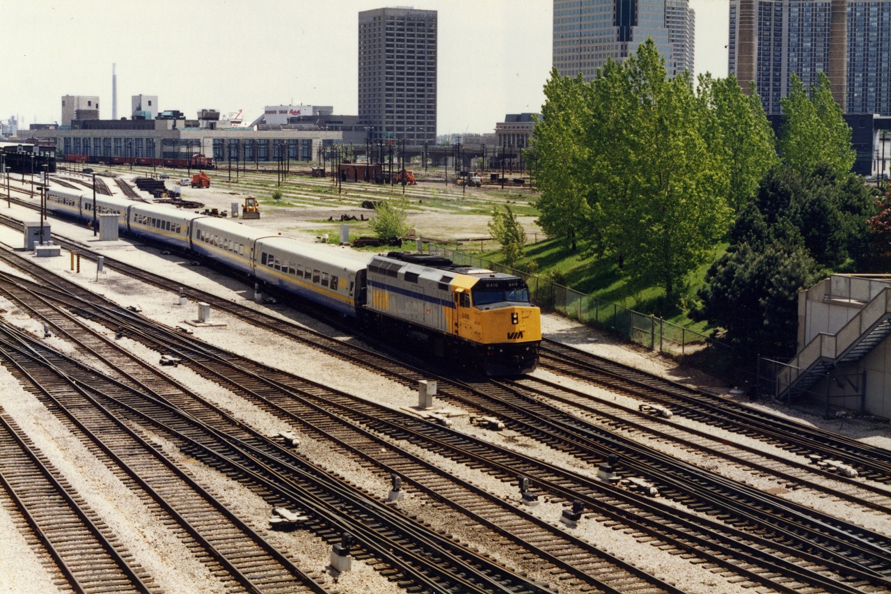 Caption: Relatively new F40 6416 leads 5 LRC cars west out of Union Station back when the skyline was relatively uncluttered. In the background a CP SW1200 is pulling some gondolas past the postal delivery building. Back in those simpler times the convention centre had an open air exit corridor along the back of the building you could access to get a decent vantage point. It got closed off a year or two later.