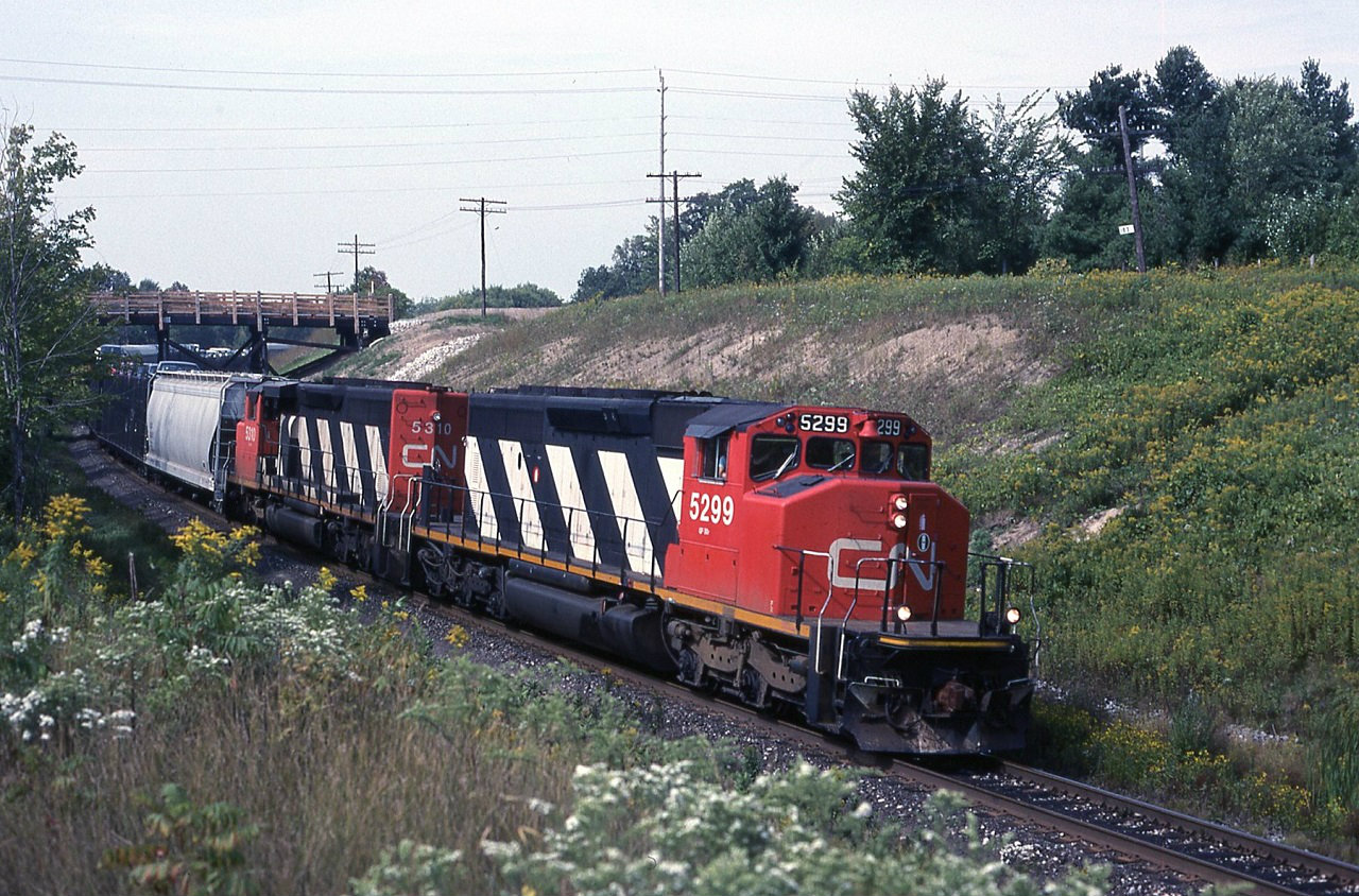 Caption: Detour train CN 308 with SD40-2,s 5299 and 5308 duck under Salem road at mile 183 on the CP,s Belleville sub. A wreck on the CN was the cause for detouring trains. This didn't last long because CP could not handle the number of trains CN wanted to run. CN gave up after only a few trains and waited for there track to reopen.