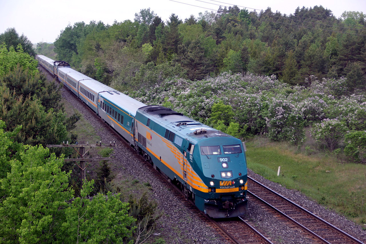 Caption: Via #62 at 11:12 AM is about to duck under the Wooler road overpass at the west end of Trenton. In the back ground the Lilac bushes are in full bloom. The incredible smell of the lilac drifts with the speed of 62s passing.