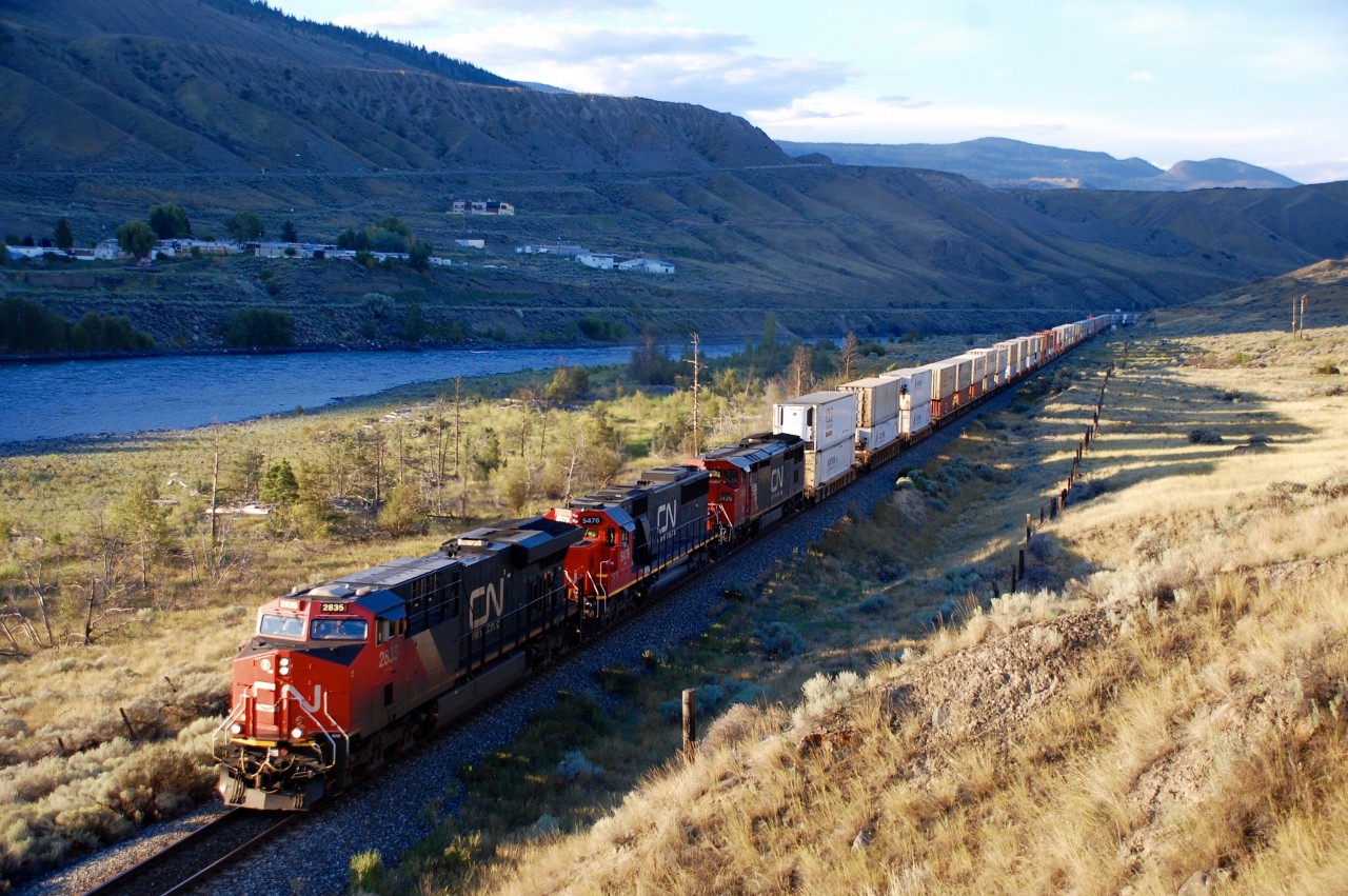 Caption: Early morning in Ashcroft as CN nos.2835,5476 & 2429 bring an eastbound Intermodal alongside the Thompson River.