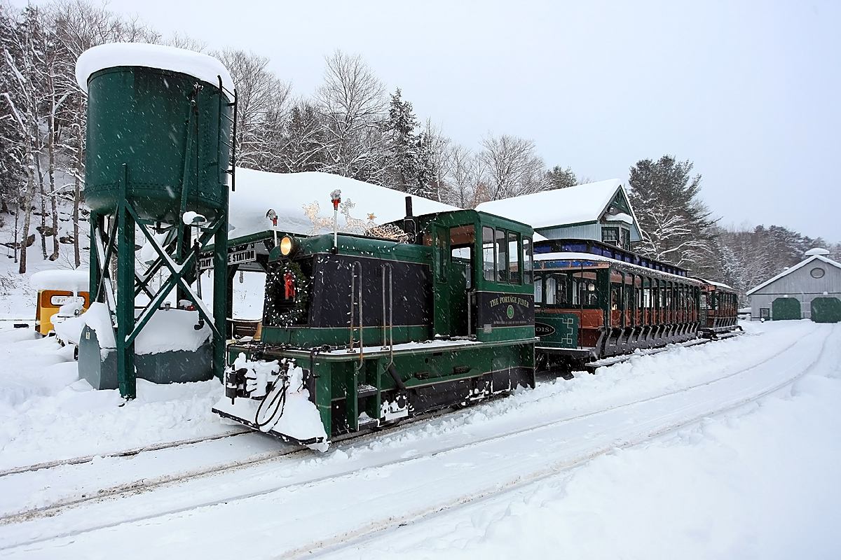 Caption: Preparing for the annual Christmas (Santa) Trains is a lot of hard work. Starting the previous day we go in, clear snow from the switches and ice from the crossing flangeways then plow the line. Our "plow" is nothing more than a spare tie laid up against the locomotive's front frame member then chained to stay in place when reversing. Since the station at Fairy Lake, the far end of the line, is off the grid and unfortunately a prime target for vandals, we leave the decorating for the day of the event. We begin that day early in the afternoon with another plow run (hey, we get snow here, what can I say?) then begin the process of shipping decorations, generator, gas heater, snowblower and volunteers down the line. A few hours and runs later as it's just starting to get dark we are generally ready for the final pre-event run which is to take Santa down there. By this time we have got the train decorations all lit and checked as seen in this shot. Generally by the time we return here a lineup has already started to form well in advance of the advertised runs but since we now have everything ready to go we get right to it to try to keep the line-up manageable. This year an intimidating road conditions forecast kept the numbers relatively low, but not enough to keep right around 700 people from attending. One father I was chatting with between runs said he had come down from North Bay and would have driven twice as far to attend. I'm sure others came from even further afield, being a family tradition for many who have vacation properties or have moved down to the GTA for employment reasons. As always, a great time was had by all!