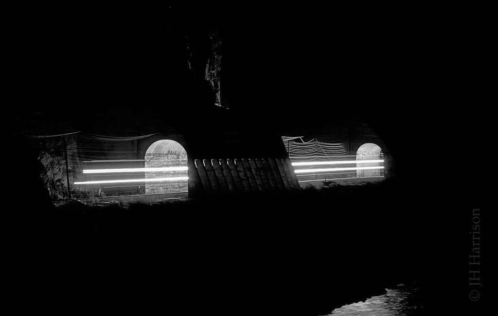 Caption: Westbound through the Skoona Tunnels at Seddall on the CN Ashcroft Sub. Both CN and CP use this trackage. I had no scanner at the time so had no idea which line was running. ISO 100 / 75 mm / 30 sec. / f5.6