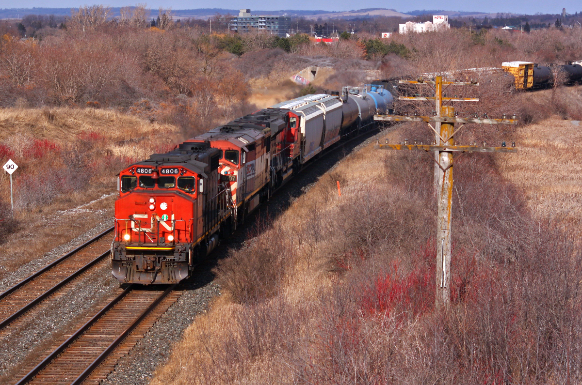 CN 373 rolls through Bowmanville with a veteran leader. Still earning its keep, the 4806 was added onto the head end at Brockville after the BCOL unit succumbed to major issues.