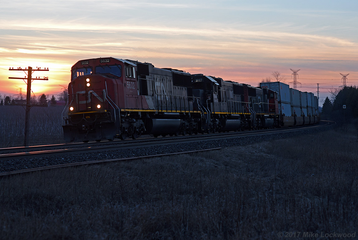 Caption: As the sun sets, CN 148 rounds the curve at Lovekin as they get into the climb towards Newtonville. There is no sign of the train slowing as it passes, so CN 5632, IC 1017, and CN 5783 must all be performing adequately today. 1919hrs.