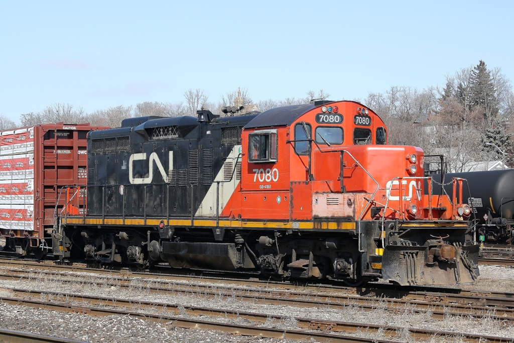 CN 7080 sits awaiting its crew.  This locomotive will be the power for CN 580 out of Brantford today.