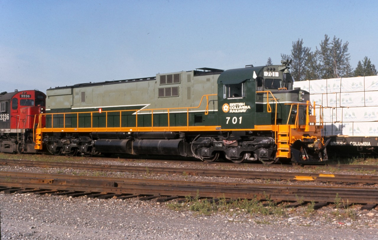 Caption: A sunny morning at Quesnel BC as the regular symbol freight "VO" pauses in the siding. Engine 701 is sporting fresh paint after undergoing major overhaul. White flags indicate "run extra" northward from Williams Lake to Prince George. The crew will take rest at Prince George and then return to Williams Lake, departing Prince George later in the evening, most likely on #38 the OV symbol.