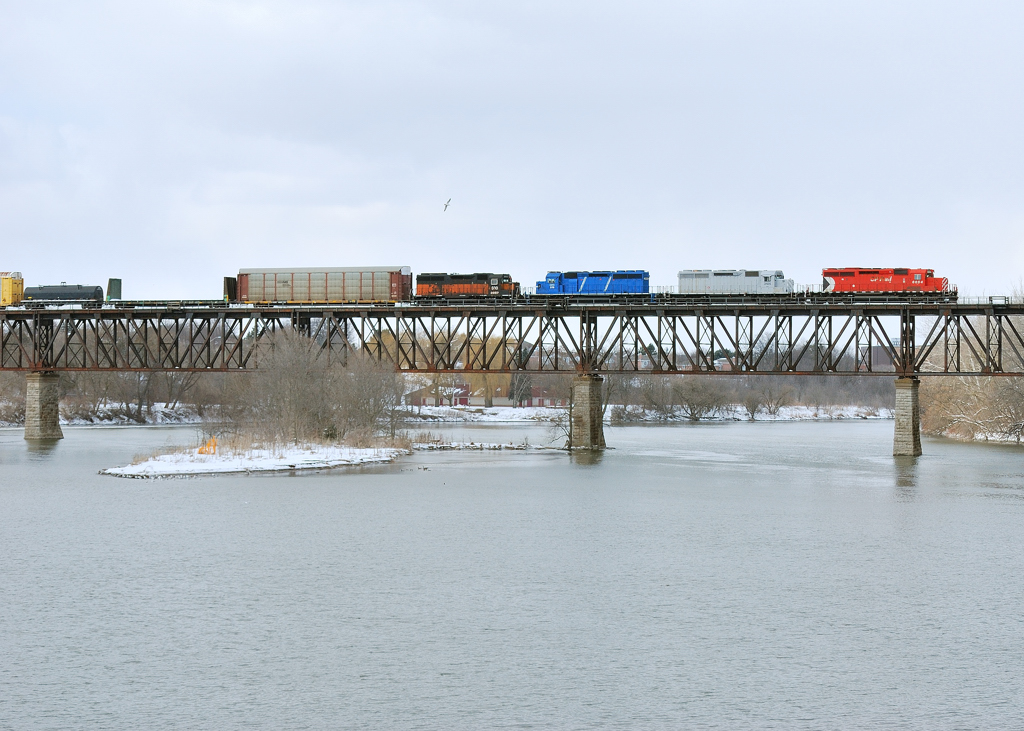 CP 240 Crossing the Grand River with a colourful consist which includes a SOO Bandit