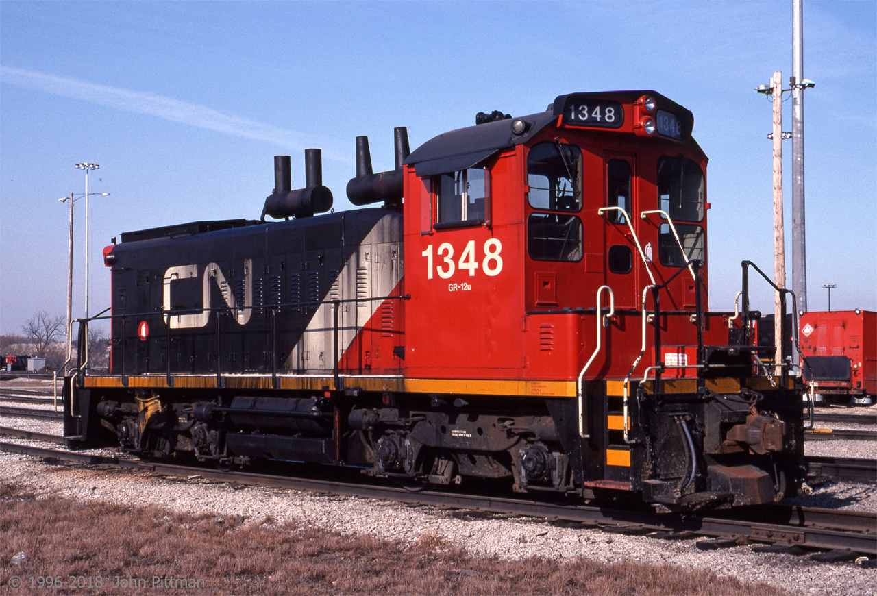 I think the cylindrical pipe style was the earliest GMD version, delivered on a bunch of new units starting at 1338. Most of the earlier units were built with standard straight stacks, and later retrofitted (there’s a photo out there of 1301 switching in 1959 with GP9-style spark arrestors with no pipe extensions). The later tapered stack style became standard, although some units got the stubby short style found on GMD1′s.