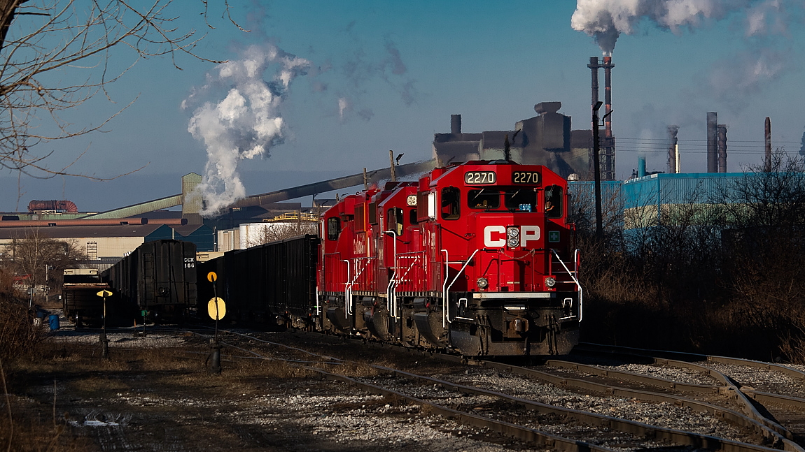 Caption: The belt line jobs waits in Strathearne Yard for things to clear on the other side of Parkdale Ave, where loaders at American Iron and Metal were working furiously to load a couple more gons that were clogging up the access. Once loaded, AIM's trackmobile moved them out of the way and CP was able to do the switch. The delay allowed me to take a few shots which was fortunate. The conditions were sunny but the smoke pouring out of Columbian Carbon to the south was casting streaky shadows on the power depending how the wind was blowing.