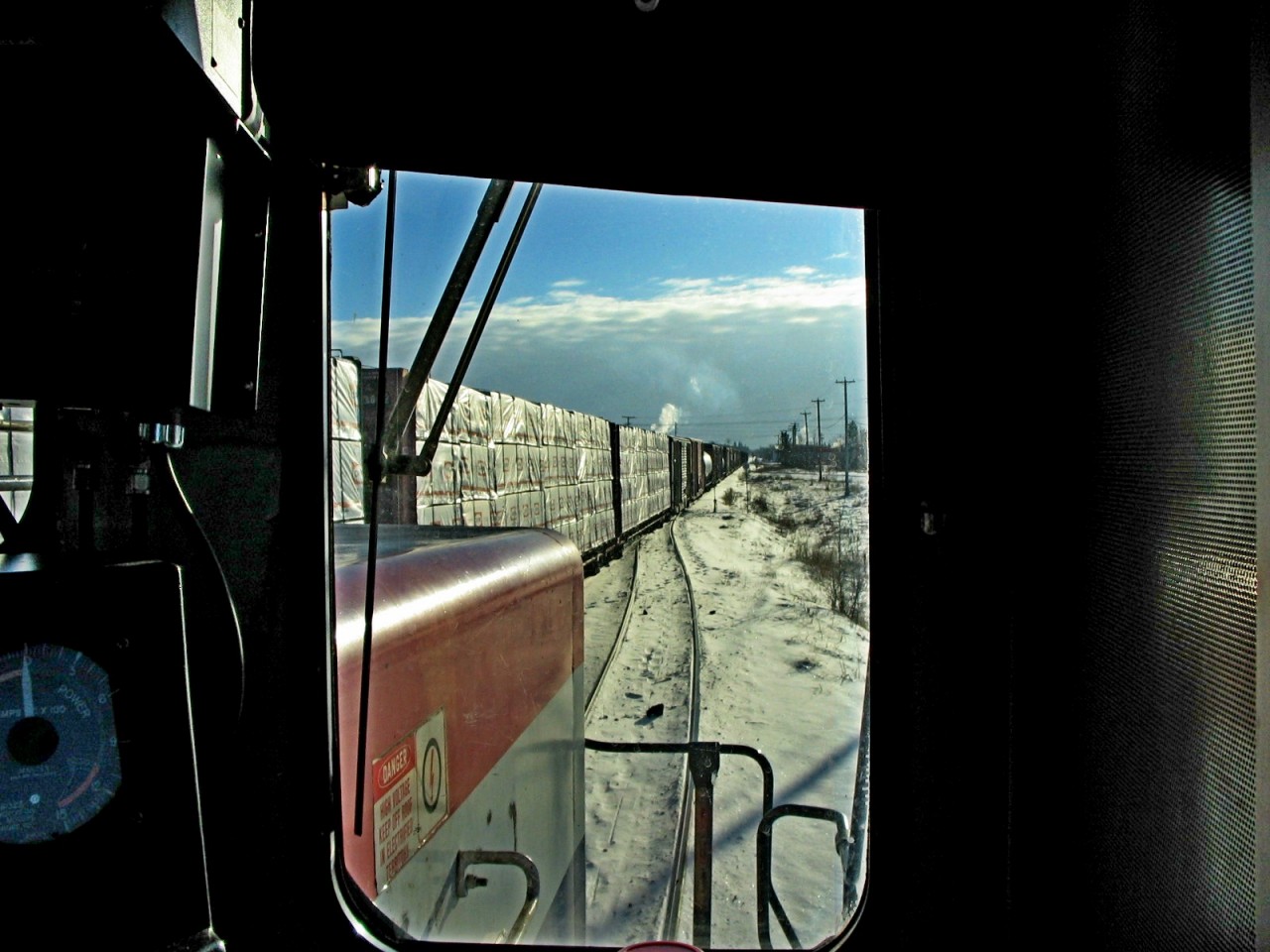 Caption: On a bitterly cold afternoon, at Miller switch, waiting for the north bound train to clear so we can proceed south from Prince George to Williams Lake on the former BC Rail, Prince George subdivision. The train pulling by is the one that we had departed northward from Williams Lake the previous day December 31. My Conductor and I had the dubious honour of being the first crew of the new year to be relieved enroute. The crew that relieved us at Dunkley ran into some issues and took over 8 hours to switch the sawmill at Dunkley and travel 50 miles to Prince George.
