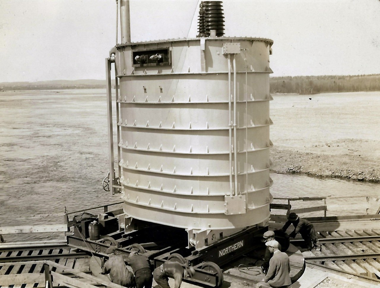 Caption: A large transformer on a wide gauge dolly is rotated on a turntable to allow the dolly to be moved to the mounting location of the transformers. The transformer will be rolled off the dolly into position via the rails on top of the dolly and rails at the mounting location. Note that there are four rails on the left side of the turntable and two on the right. The main generator building would be just to the left of the photo. It would appear that the wide gauge rails ran into that building as well. The rails to the right arced around the transformer and breaker areas and connected to the CNR line between Ottawa and Arnprior. My Grandfather worked on several large infrastructure projects in the 1930's and took photos of several locations. Not much in the way of safety gear or appliances in those days other than a hat to keep the sun off your head.