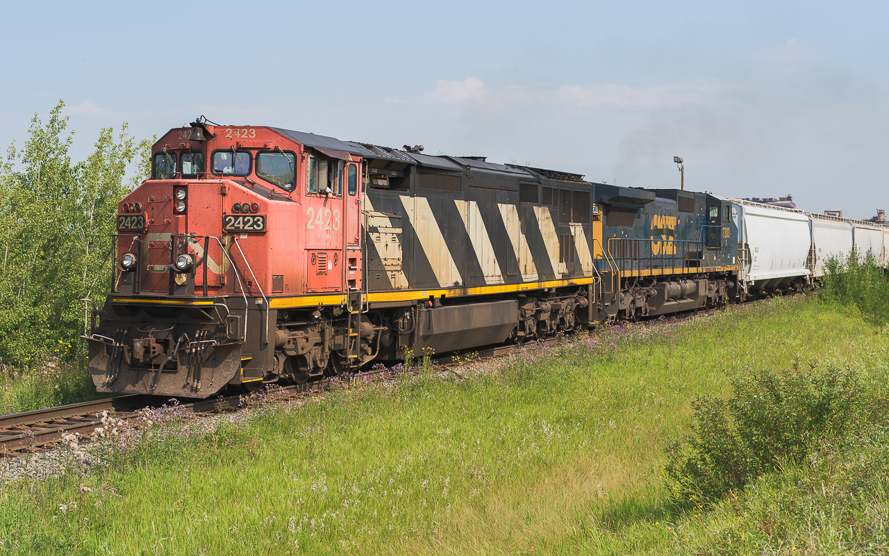 CN 2423 and GECX 7303 are on the way to Calgary with a mixed freight.