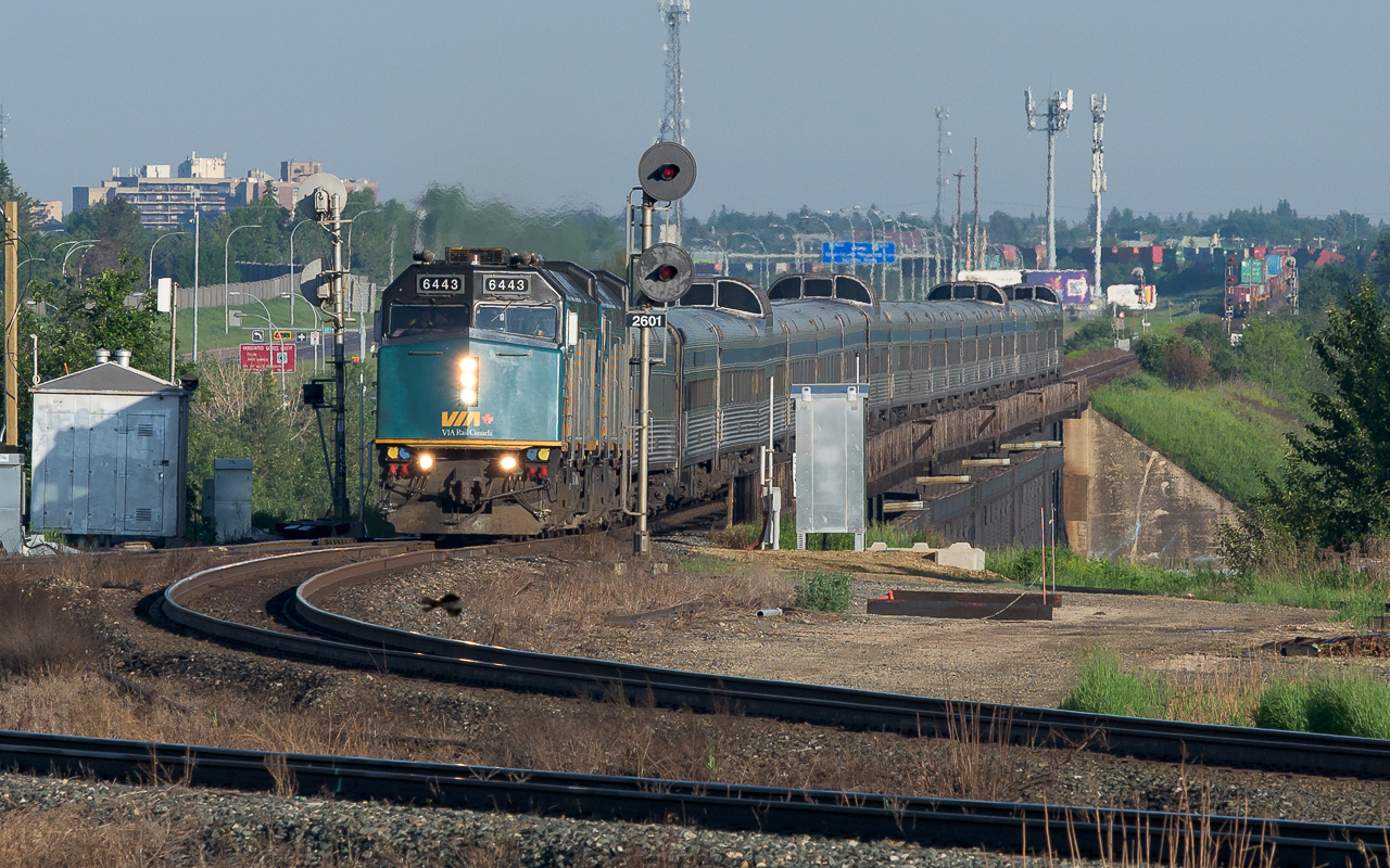 Caption: If I have read the VIA schedules properly, this train was to have departed at 19:50 on Saturday and here it is 7:30 Sunday, making No.2 approx. 11½ hours late. You can see an intermodal curving west around the bend in the distance. It was a nice meet between these two, the tailend no sooner was to clear and No.2 came around the corner, only having to slow for a moment waiting for a light to continue. The 6435 is in behind with 21 cars making up the train.