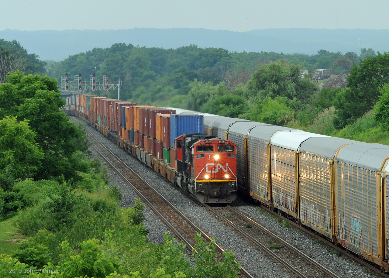 Caption: Eastbound intermodal train CN 148 on track 2 is overtaking the tail end of CN 422, tied up on the track 1 while its crew does work in Aldershot Yard. Westbound signals for CN Snake are in the background.