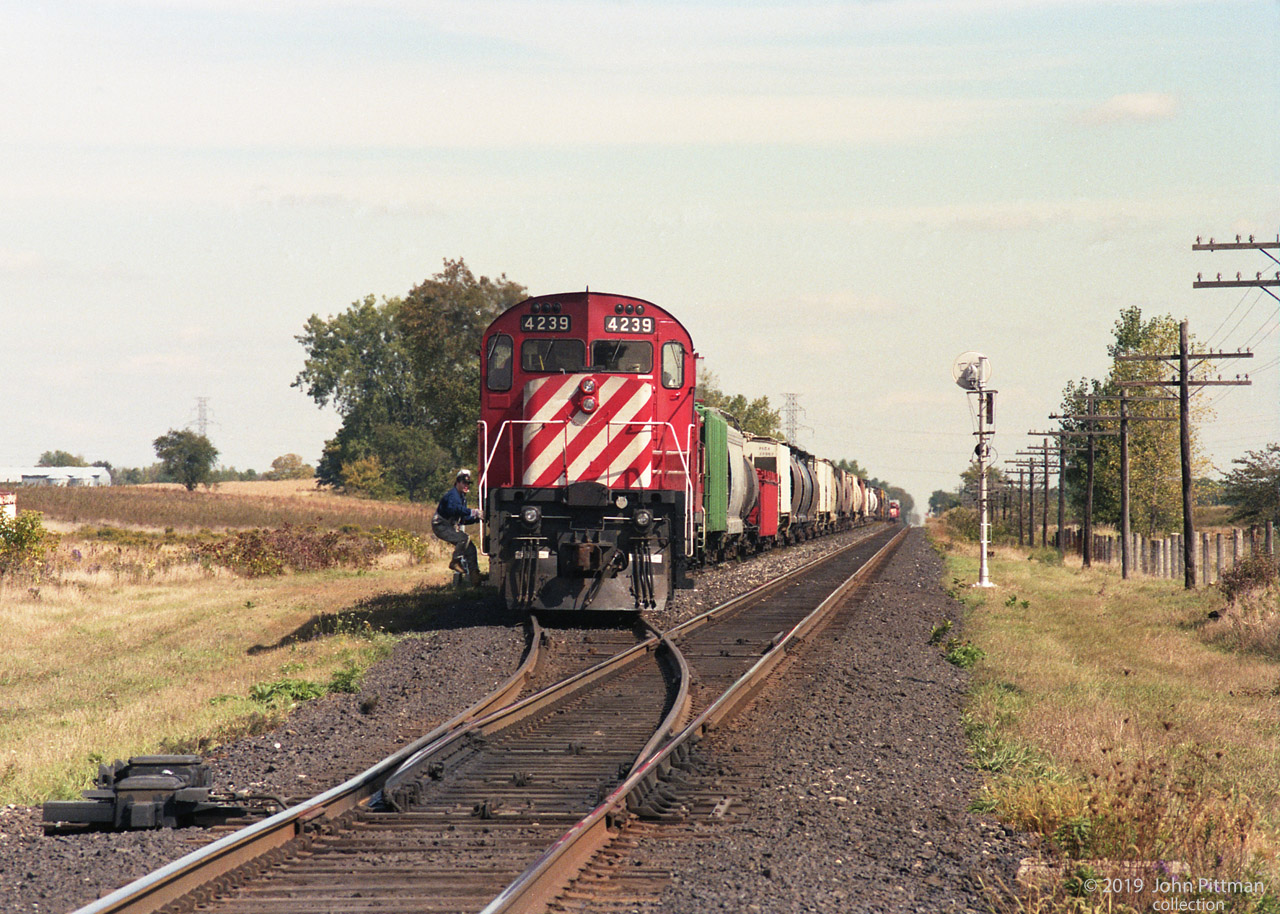 Based on Mr. Noe’s comment and some checking with “streetview” I agree it’s CP’s Nissouri. Looks like the photographer was at the Purple Hill Rd grade crossing, facing east, then the west end of Nissouri siding. (Siding has since been extended.) The high voltage power line is a useful landmark. Purple Hill Rd is 3rd crossing east of Nissouri Road, which is why I didn’t find Nissouri siding in the first place.
