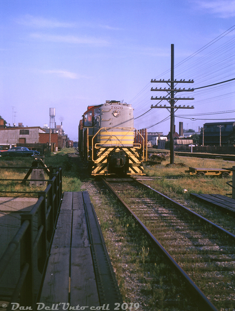 Caption: On a sunny summer evening, CP S2 7026 works on the "Old Bruce" service track in the West Toronto Junction area, switching a few industries located along the east side of the rail corridor at Bloor Street West underpass. 7026 was one of the longtime Toronto-assigned Alco switchers that took care of local and yard switching duties for decades, at the time assigned out of Lambton Yard. A CP RS18 is visible in the background on CP's Galt Sub, which was separated from the old Bruce service track by CN's Weston Sub that ran through the middle of the corridor. Judging from some other slides taken at the same spot at the same time, the unknown photographer (likely visiting from the US) was taking photos of TTC streetcars on Bloor off the top of the bridge, and probably snapped a shot of this switching job when it showed up.