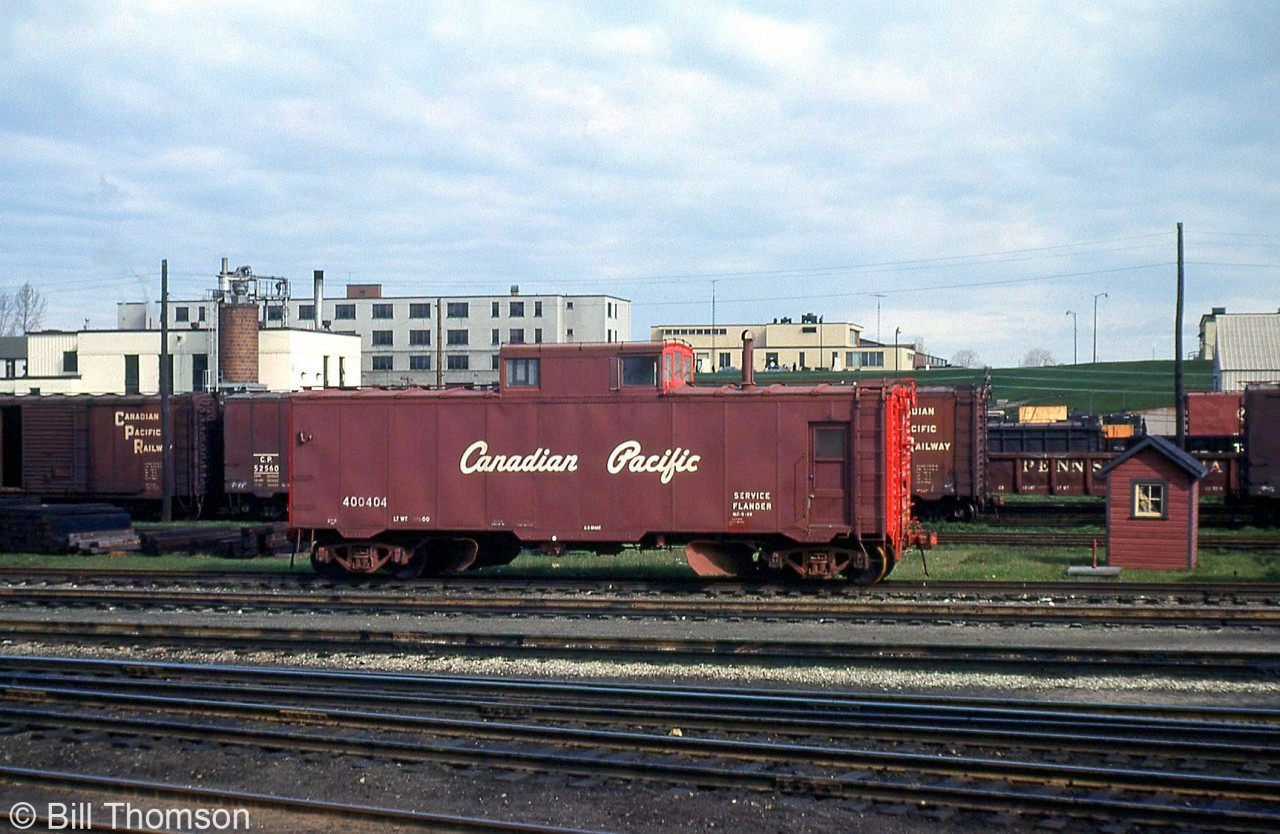 Caption: Canadian Pacific flanger 400404 is seen amid other freight equipment in the yard in London in 1966. Like CN, CP also had their own flanger cars stationed around the system for clearing snow and ice from the flangeways between rails.