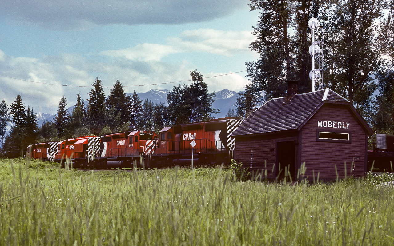 Caption: This eastbound piggyback train has only another 7.1 miles left on it's trip to Golden. I can only make out the first 3 numbers of the lead unit (the last may be a 5). The 5639 (with elephant ears), 5766 and 5715 trail. The elephant ears were the reason for this photograph. I was visiting relatives in the area at the time and I had to cut short the chase, with this being my best of the few shots I made. The rain clouds actually worked in favour of the photo, otherwise it would have been somewhat backlit. I believe the time is in the first half of July, actual date is unknown.