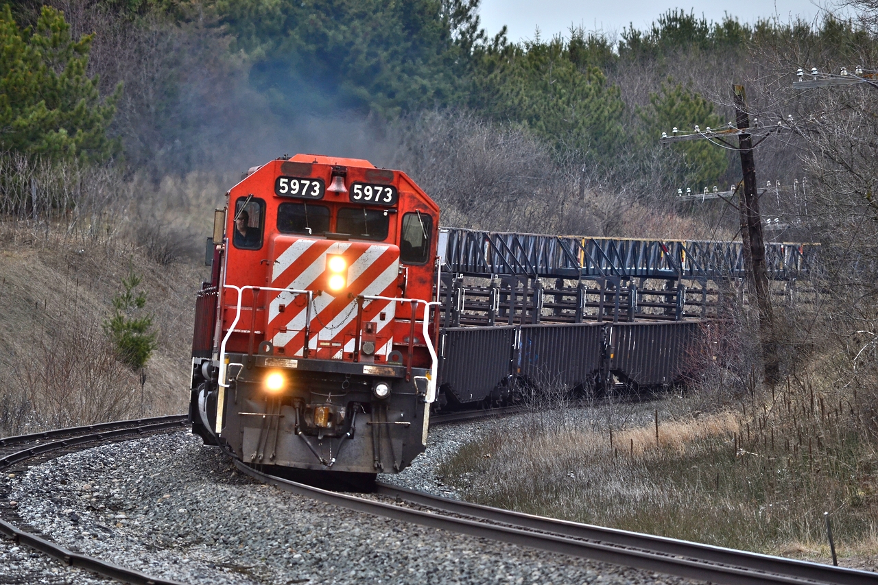 Caption: With word going around of another CWR train working its way into Toronto today, I wasted no time getting up to the Mactier. The Mactier Sub isn't a subdivision I have spent much time with. The sun being less than favourable for Northbounds and pretty tight shots, not to mention at least an hour drive to get to at least VIT. Today is an exception, CP 5973 leads another CWR train into the town of Palgrave, hard to believe that rail is from 1928 in the siding track.