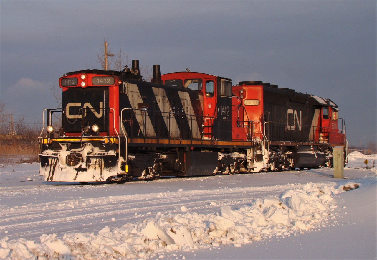 Caption: CN 1412 along with 6020 make up their train in Van de Water Yard before heading down the CASO on their way to London. I caught up with this train about an hour later near Essex seen here .