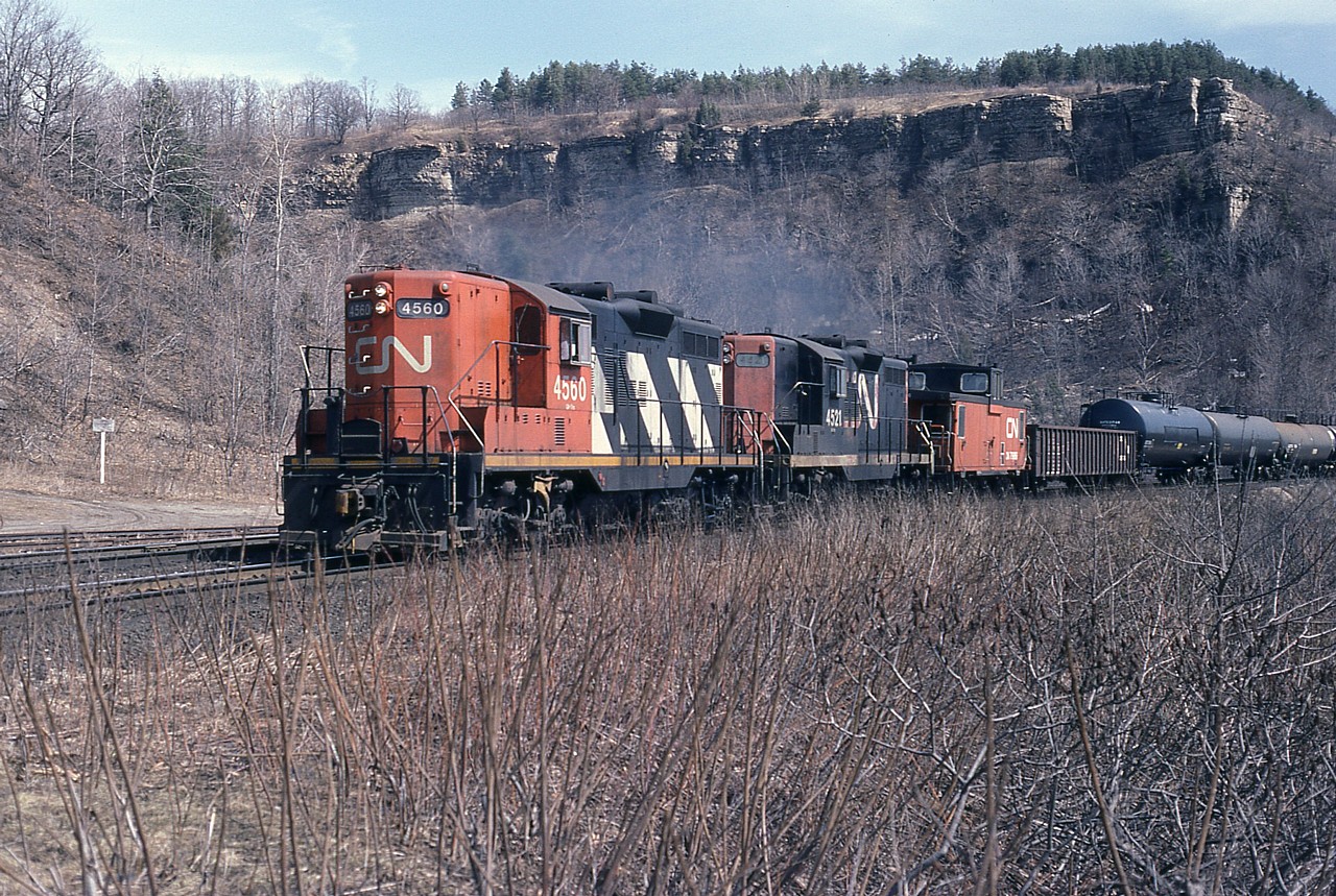 Caption: Nice late March morning up at Dundas station 38 years back. Judging by the foliage creeping up, I imagine this was the last year I was able to shoot trains rounding the bend on approach to Dundas station at such a severe angle. The era of nice clean right-of-ways was coming to an end. There's no money in chopping brush that offends train buffs. :o)