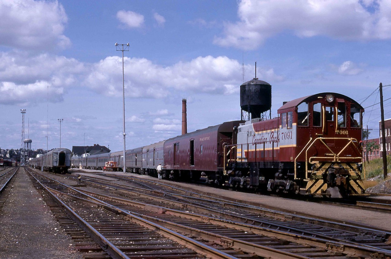 Caption: At 11.10 a.m., Sunday, August 20, 1967, the eastbound Canadian, Train 2, rolled into town behind units 1406, 8567 and 1407. The schedule allowed thirty-five minutes for the splitting of the train into sections for Montreal and Toronto. They would depart on time with 1407 removed from the consist of Train 2 with FPA-2 4083 and RS-10 8561 leading Train 12 to Toronto. All units were steam generator equipped. 1407 would turn back west on the next Train 1 at 12.10 a.m. the following morning. With the power pulled well east of the station, S-2 7091 (MLW 2-1949 #75866) went to work. Train 2 had arrived on the track closest to the station and the crew would rebuild it there. Train 12 would be readied for departure on the adjacent track. The usual three lightweight head-end cars, including two dormitory baggage cars, arrived on Train 2. Each outbound train had one dorm, and 7091 added a car behind the power on Train 2 and two behind the power on Train 12. Meanwhile, either 7090 or 7092 worked the other end of the Canadian. Using the line numbers from the CPR's folder 62-28, the S-2 marshalled the following equipment into each train. The Toronto section included Sudbury - Toronto coach 223, coach 221 from Vancouver, Skyline cafe dome 222 from Sudbury. The following cars came from Vancouver: Manor cars 213, 212, Chateau 211, a diner, Manor 210, and Manor 202 from Regina and Park dome observation 200 from Sudbury. The Montreal section included coaches 226, 224, a Skyline, Chateaux 208 and 207, Manor 206, Chateau 205, a diner, Manor 204 and Park 201. Each of the 42 Manor cars from Budd's large order of 1954 included 4 roomettes, 5 double bedrooms, 1 compartment and 4 open sections. CPR's 29 Chateau sleepers featured 8 duplex roomettes, a drawing room with three berths, 3 double bedrooms and 4 open sections. The Sunbury Star newspaper pictured the arrival of S-2s, 7090 through 7093 in 1949 not long after their construction and original assignment in Montreal. The 7090 through 7093 were soon assigned to Sudbury, but the latter soon moved on. By 1968, 7093 was in Toronto having worked in Smiths Falls. Reports vary on the assignment of 7094. Newspapers suggest that it was assigned to Smiths Falls with 7095 in late March 1949 but it is reported to have also come to Sudbury before moving to the Sault and then, by 1968, to Winnipeg. The 1,000 horsepower, turbocharged 6-cylinder 539T diesel was first delivered as the S-2 model by Alco in September 1940. It came to MLW in Canada as CPR 7077 in May 1948 and it is preserved at Exporail near Montreal as Canada's first production diesel locomotive. Variations continued in production through April 1957, allowing it and the similarly powered S-4 and S-7 to come within a hair of besting EMD's SW7/9/1200 as North America's most numerous switcher. CP Rail sold 7091 to nearby Inco for use in its nickel production facility on Monday, June 16, 1986. It left their roster for scrapping in 2000 wearing number 204.