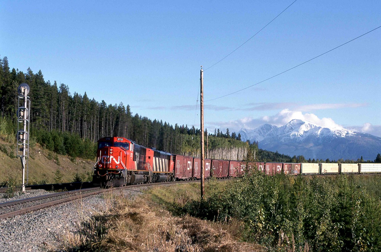 Caption: A Canadian National eastbound off the Prince George line is about to enter the Albreda subdivision at Mileage 70.6 Spicer, British Columbia, on September 26, 1997, and continue east towards Jasper.