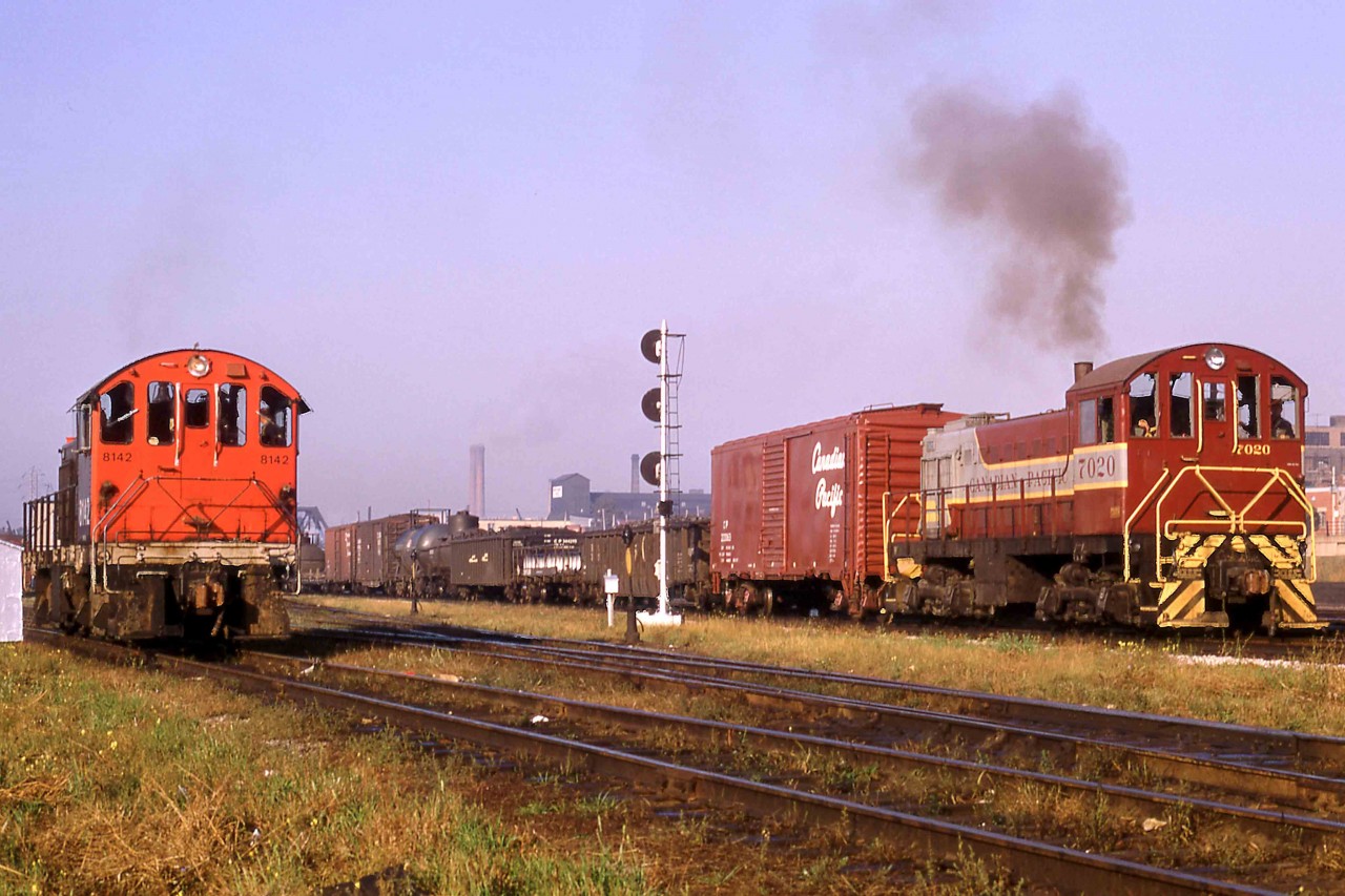 CPR S-2 7020 (serial 72855) celebrates its 23rd birthday by pulling by CN S-4 8142 on Saturday, October 7, 1967. The pair are immediately west of Spadina Avenue in downtown Toronto as the CPR switcher handles a transfer from Lambton Yard to downtown. At the same time, the CN switcher waits to access Union Station.